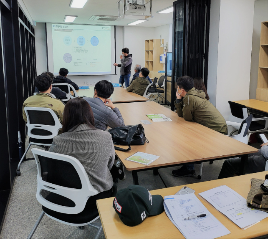 견학단은 이장님의 중심지 사업 협동조합 운영 강의를 듣고
