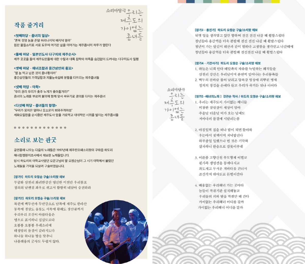 이번 작품은 다섯마당으로, 서로를 도우며 어기찬 삶을 이어가는 제주좀녀의 하루로 시작하여 제주해녀들의 힘겨운 삶 뿐만 아니라 일제의 수탈과 횡포에 저항하여 세화일대에서 대대적인 시위를 벌이는 제주해녀들의 모습을 담아내고 있습니다. 또한 공연중에 나오는 노래들은 1997년에 제주민요패소리왓이 구좌읍 하도리 해녀항쟁현지조사에서 채보한 노래들입니다.