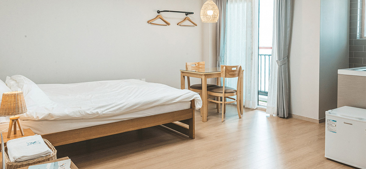 ‘기뻐하다’의 제주어로, 기쁜일이 가득한 곳 이 되길 바라는 마음을 담아 준비하였습니다. 방이 넓고 2층 침대와 더블 침대가 있어서 아이가 있는 대가족이 이용하기 좋은 방입니다.