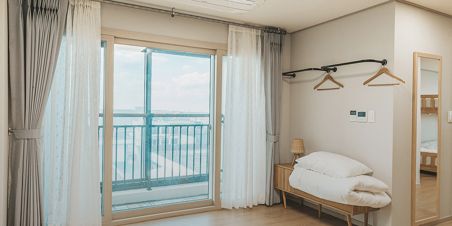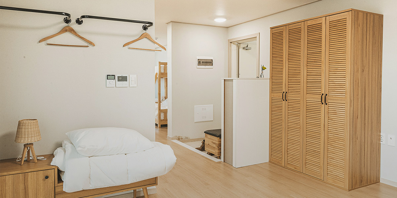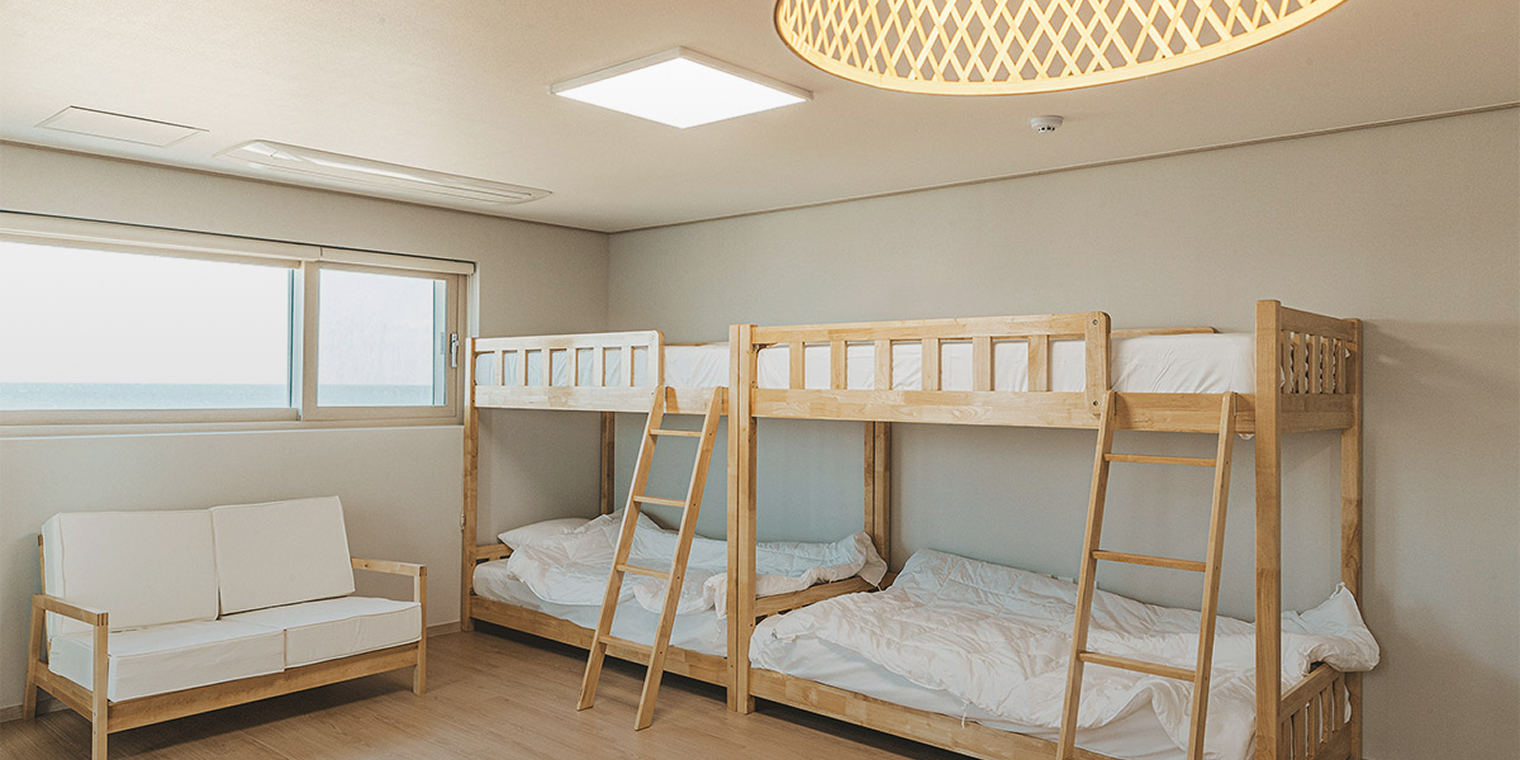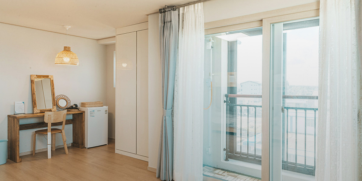 ‘반짝반짝’의 제주어로, 반짝이는 햇살처럼 눈부신 여행이 되길 바라는 마음을 담아 준비하였습니다. ‘세화밖거리’에서 바다뷰가 가장 좋은 방이며, 더블베드 1개와 요를 깔고 세분이 주무시기 좋은 공간이 있습니다. 더블베드는 코웨이 진드기 케어를 받고 있습니다.
